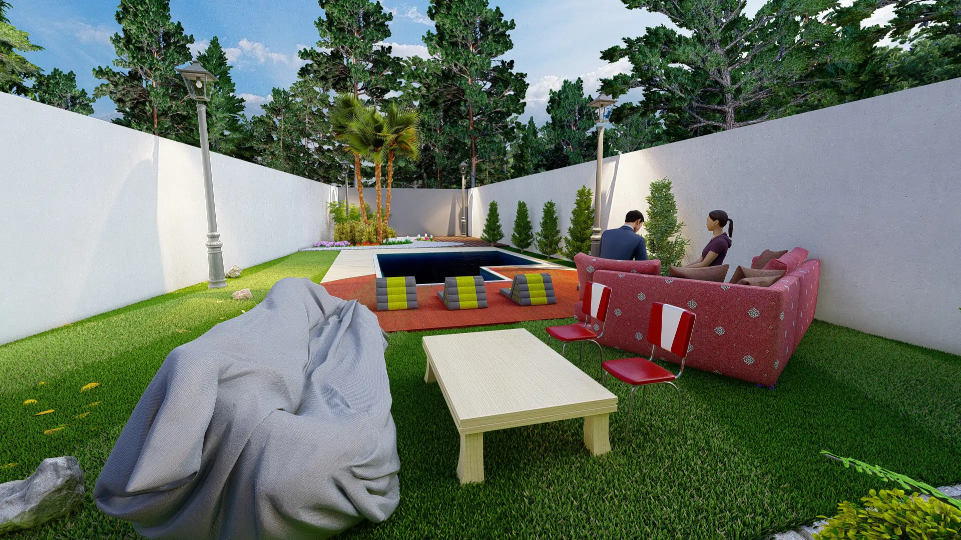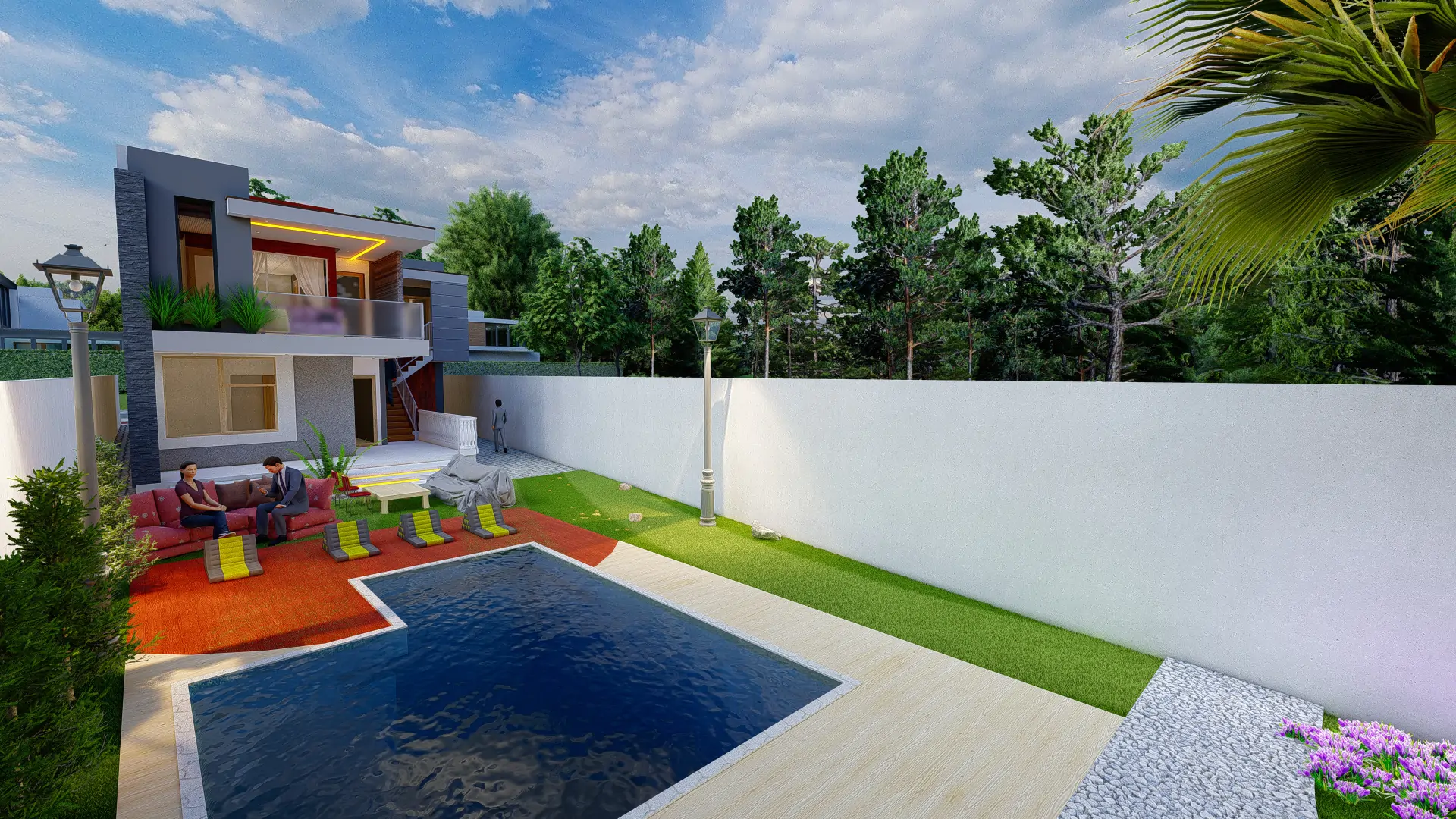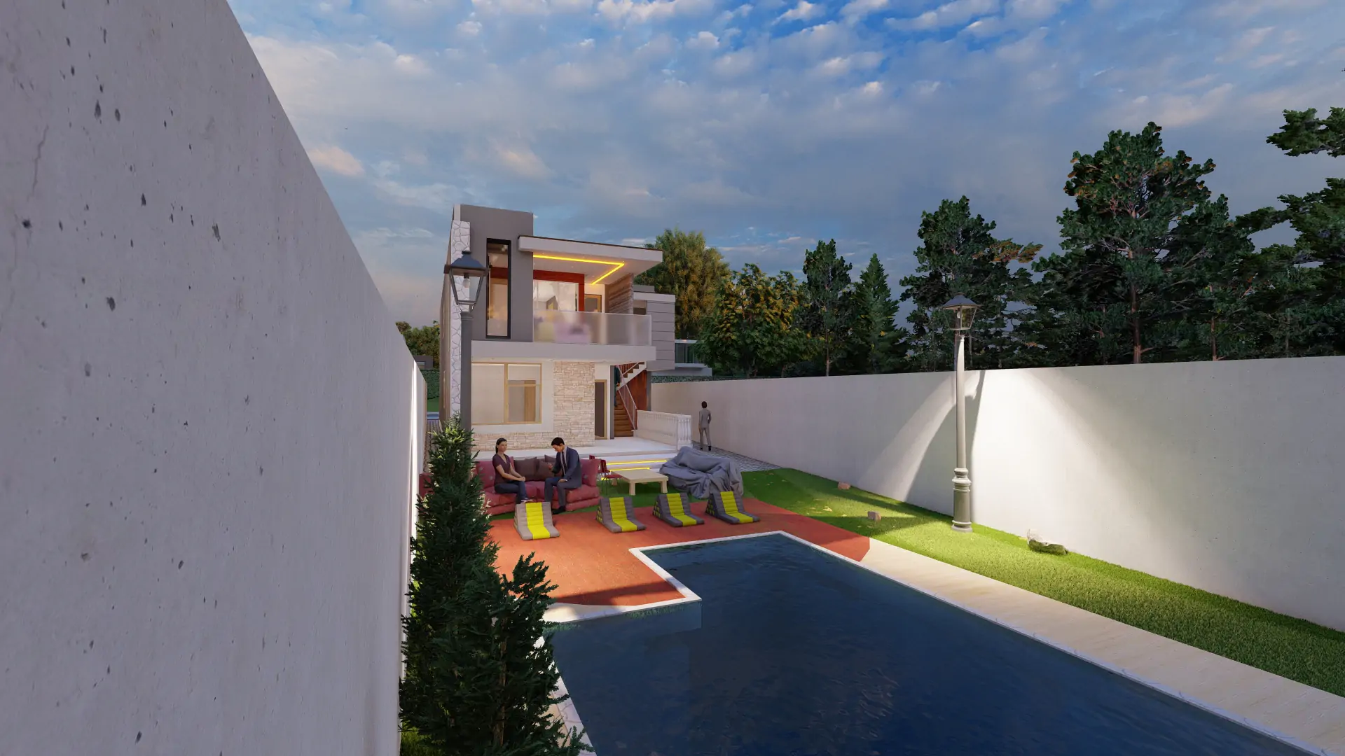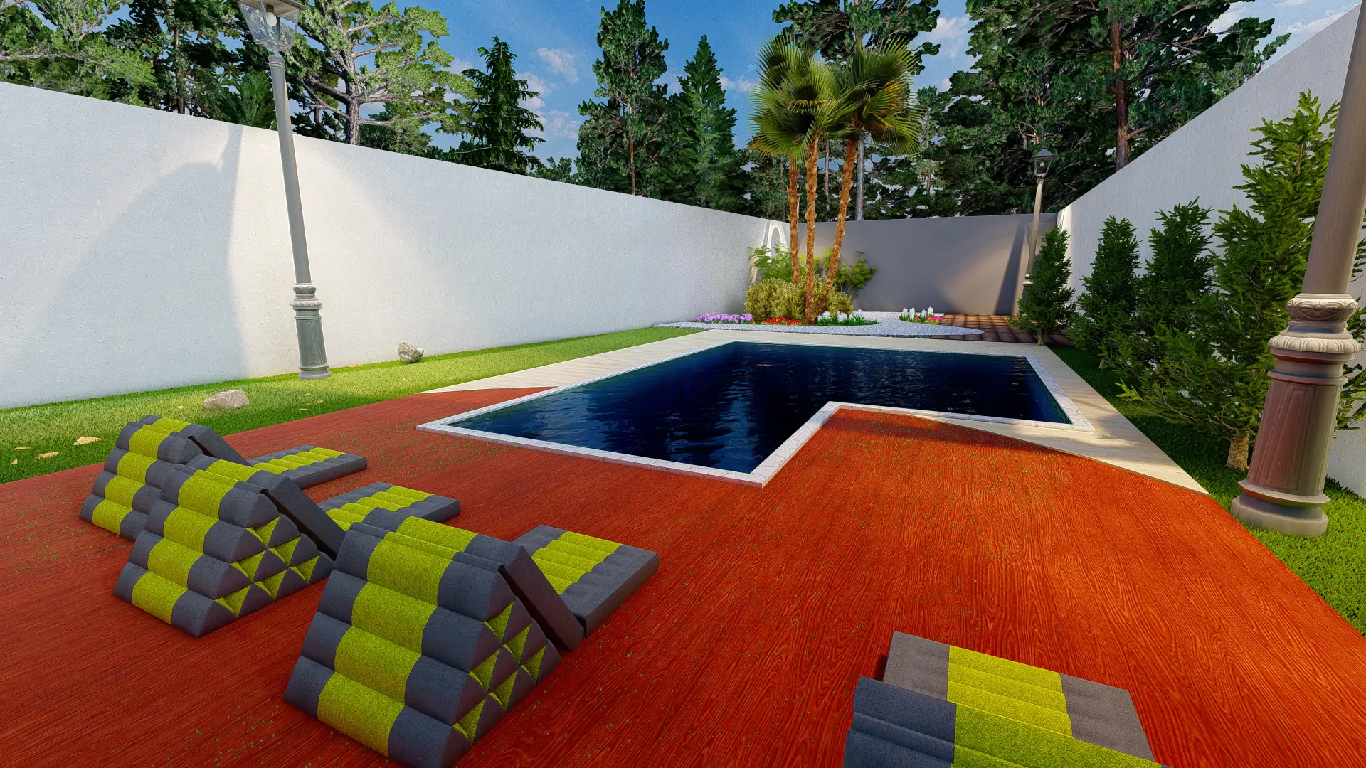 Terrasse arrière ouverte sur un espace somptueux avec piscine et aire de plein air – parfait pour les week-ends en famille, les réceptions et les instants de loisirs.